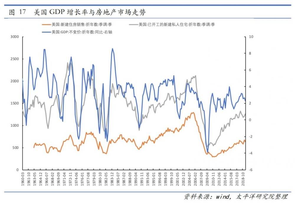 综合以上因素我们认为,二十世纪七十年代前后,在人口增长减速、新生儿减少、城市化放缓的综合作用下,美国的房地产市场需求也开始随之减速或下滑。而当需求不再大幅增长后,房地产市场是否还存在某些规律性,其与整体经济的关系又有怎样的变化,这就是我们接下来要讨论的问题。