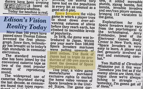 消息最早的出处众说纷纭,但通常认为来源于 1979 年 5 月 13 日的《日本经济新闻》。此时距离《太空侵略者》发售刚刚过去一年,游戏的热度也恰好达到了峰值。