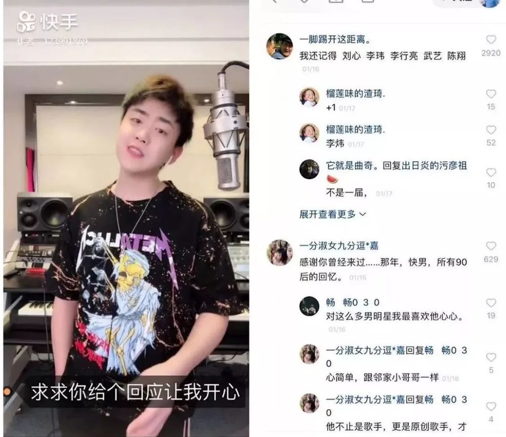也有人尝试新的演出方式。2017年底,刘心注册了快手账号,除了上传唱歌视频和音乐作品外,偶尔还会直播。很多人看了他的视频后对他的实力大加称赞,也对他没有大红大紫表达了惋惜。