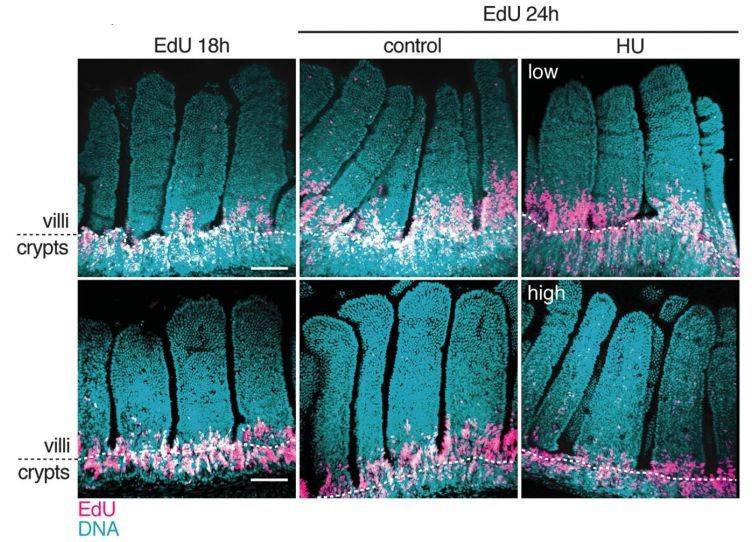 在第一个实验里,研究人员们使用一种叫做羟基脲(hydroxyurea)的药物,来短暂抑制细胞分裂。按过去的主流模型,如果新分裂出的细胞是把上皮细胞“顶上去”的源动力,那么抑制细胞分裂,我们应该看到这些绒毛上皮细胞停在原处,或是移动的速度大大放慢。