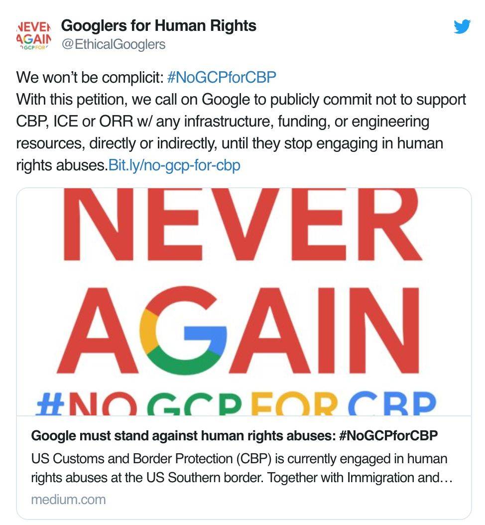 抗议者在Medium发布一封题为“谷歌必须反对侵犯人权”的请愿书,指出CBP的云服务合同在谷歌的普通员工中引发了争议,原因是该机构最近在美国南部边境处理移民问题上忽视人权。