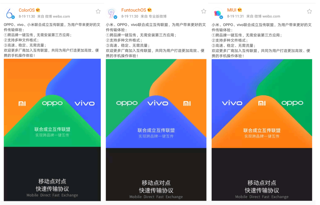 上午 11:30 分,小米、OPPO、vivo 宣布联合成立“互传联盟”,三大品牌也是默契地在同一时间发布了微博(虽然宣传图上都是自己站 C 位)。打通以后,三家厂商的手机将支持跨品牌的文件互传以及数据迁移,近期开启公测。