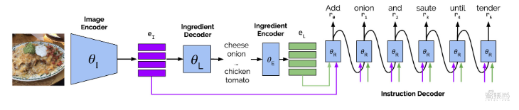Facebook换了一种新思路,将图像到配方问题公式化为条件生成问题。即:使用预先训练图像编码器和成分解码器,以图像及其相应的成分列表为条件生成指令序列,以此生产可能的菜谱。