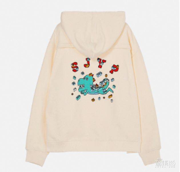 ▲这款卫衣背部印有SJYP的logo、卡通图片、不规则排列的方块模块。