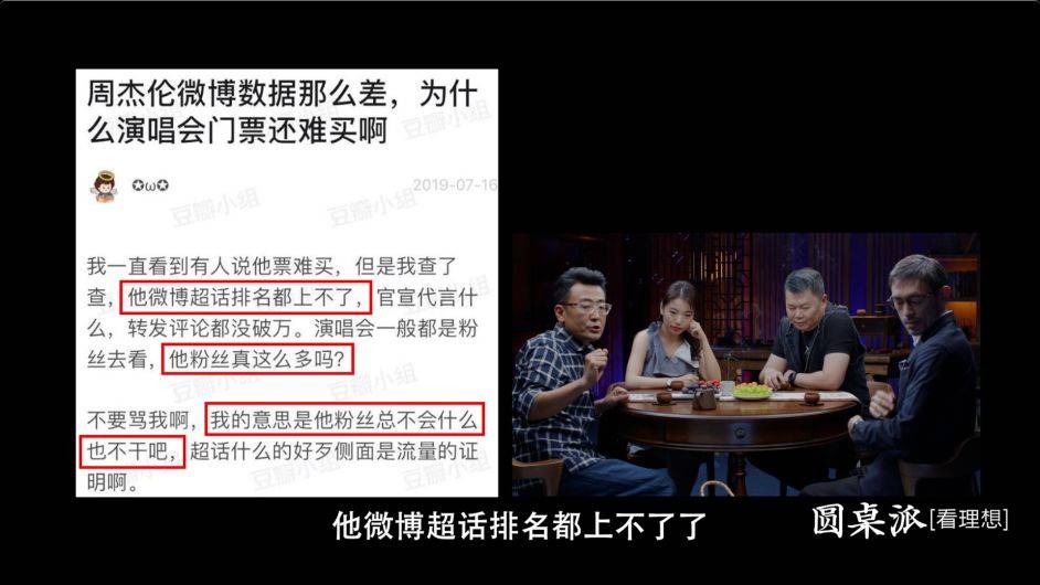魏武挥:那还可以相互比较,所以最近不是刚出了一个特别搞笑的事情,就是有人发现周杰伦没有粉丝给他打榜,然后就觉得他票怎么能卖得掉呢?
