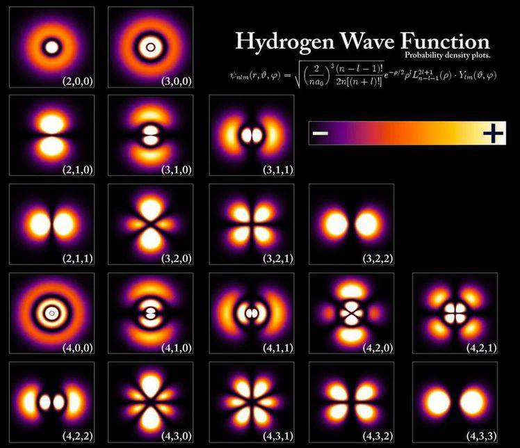 能级和电子波函数与氢原子内的不同状态相对应,其他原子也有类似的构型。能级是以普朗克常量的倍数量子化的,轨道和原子的大小则是由基态能量和电子质量决定的。附加的效应很微弱,但是能以可测和可量化的方式改变能级。原子核的势就像一个“盒子”,禁锢了电子的物理范围,类似于“盒中粒子”的思想实验。| 图片来源:维基共享 PoorLeno