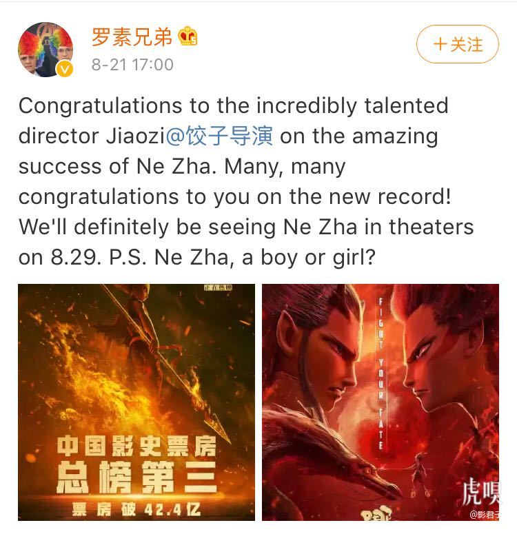 @微博【《复联4》导演祝贺《哪吒》票房进入中国影史票房前三】8月21日,《复联4》导演罗素兄弟发文表示,恭喜《哪吒》票房进入中国影史票房前三,取得新纪录。并称《哪吒》北美上映时一定会去看,还好奇地问了句:哪吒到底是男孩还是女孩?