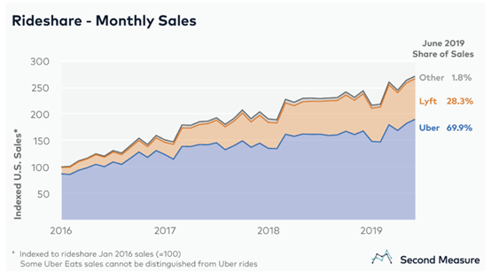 (Uber、Lyft市场份额情况,图片来自Second Measure网站,版权属于原作者)