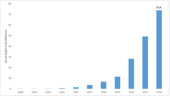 (2008-2018年Airbnb在美国市场的住宿量增长,图片来自Hotel online网站,版权属于原作者)