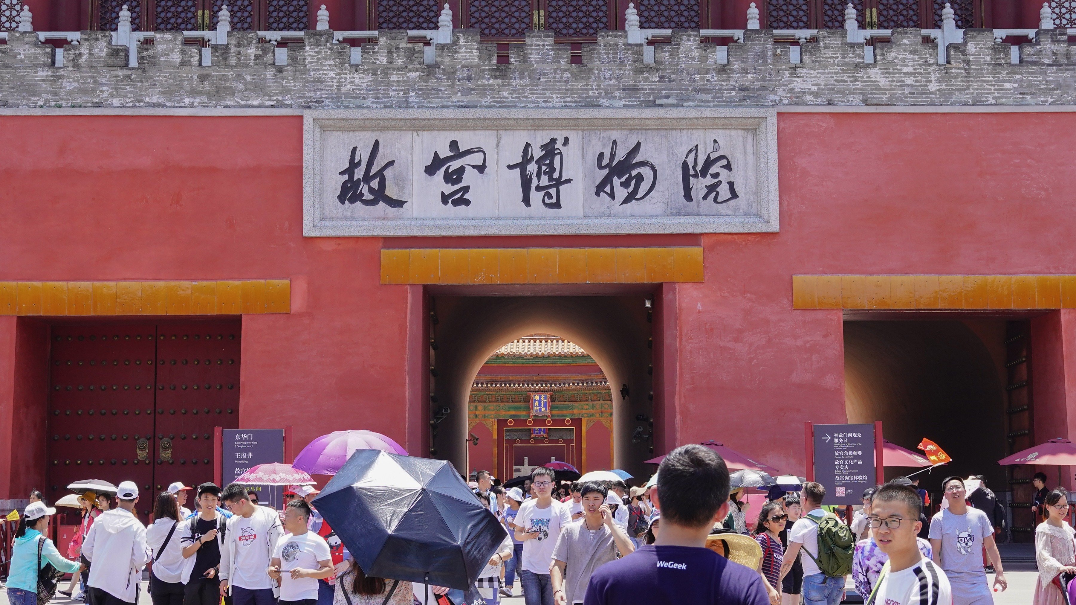 我们打开门望进去看,太和殿里龙座前面六根盘龙金柱,梁枋上双龙戏珠,天花板上一个个小方格,我们称为井字天花,每一个格里有团龙。
