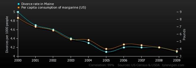 美国缅因州的离婚率(蓝)与人造黄油的人均消费量(橙)。| 图片来源:Tyler Vigen/Spurious Correlations