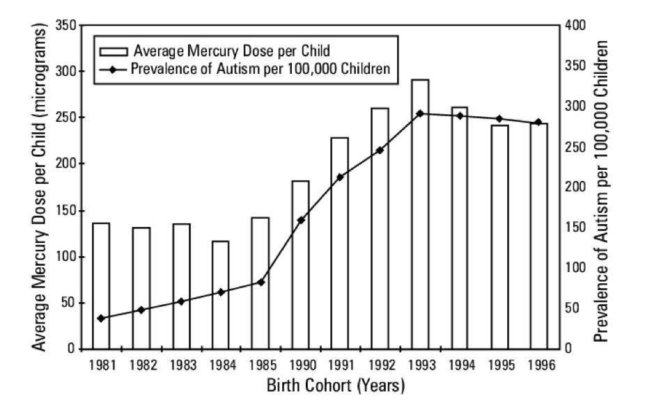 通过接触疫苗而接触到汞(柱状图)与自闭症的发病率(点线图)。| 图片来源:David Geier and Mark Geier