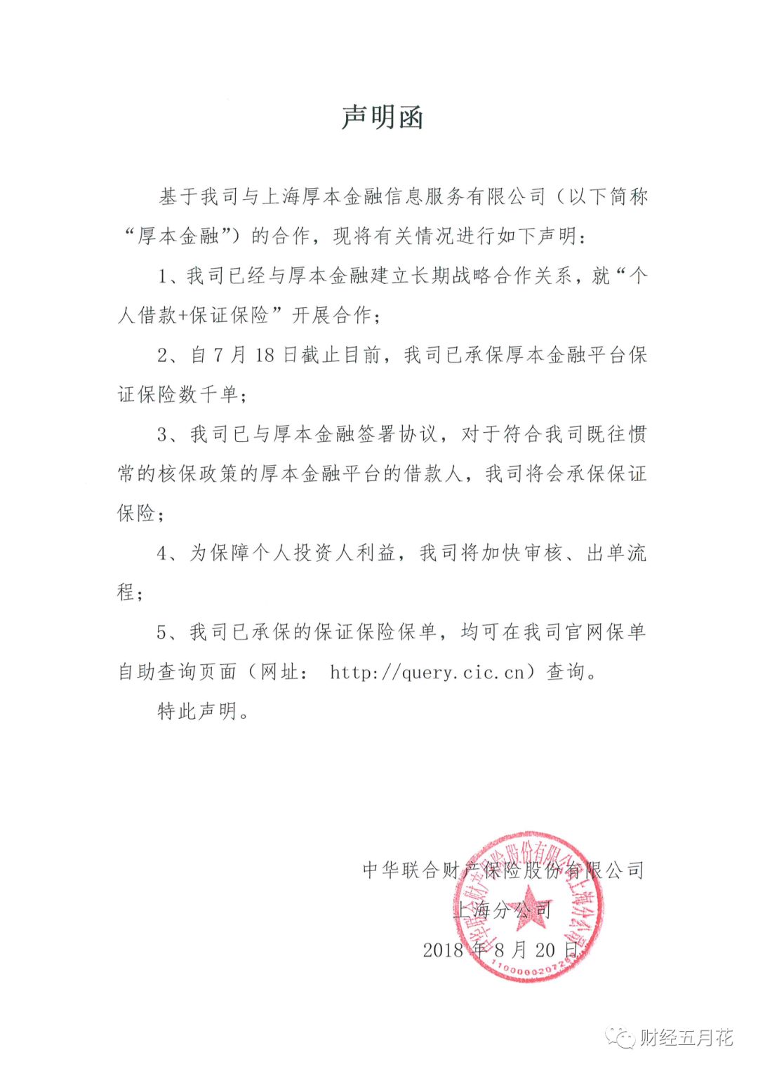 公开报道显示,厚本金融与中华财险合作的厚保宝在2018年6月推出。厚本金融在官网披露的中华财险出具的声明函显示,双方已建立长期战略合作关系,就“个人借款+保证保险”开展合作。对于符合中华财险既往惯常的核保政策的厚本金融平台借款人,中华财险将会承保履约保证保险。