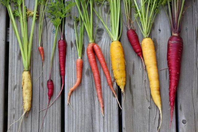 这里要专门点名一下胡萝卜同学。根据品种不同,在成熟期收货的胡萝卜有大有小,在一些情况下,为了得到小巧的胡萝卜,人们也会在成熟期之前进行采摘。