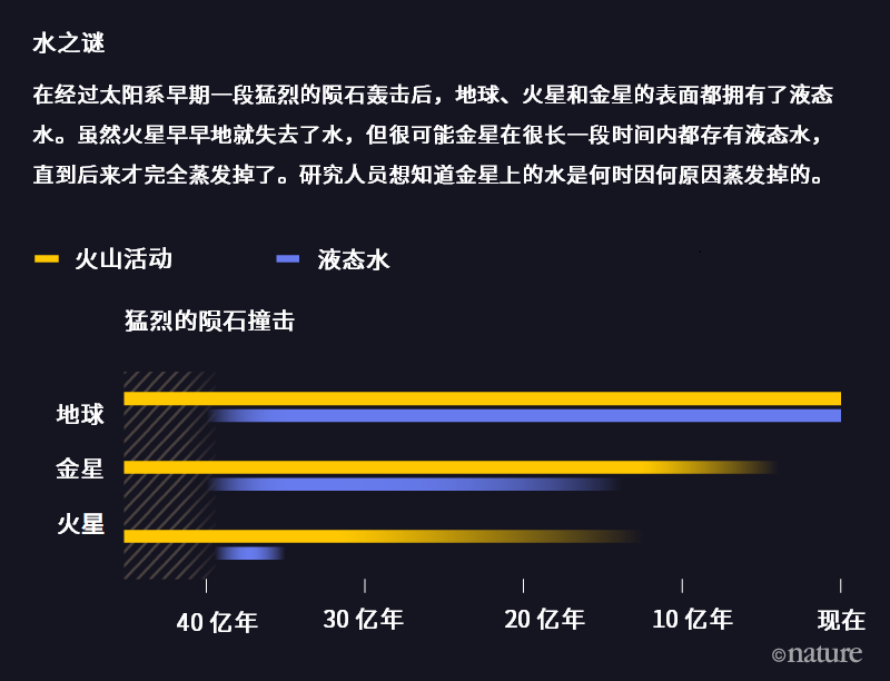 “这就是我对金星遐想连篇的原因,”美国曼荷莲学院(Mount Holyoke College)的行星科学家Darby Dyar说,“如果是那样的话,就有充足的时间让生命开始演化。”