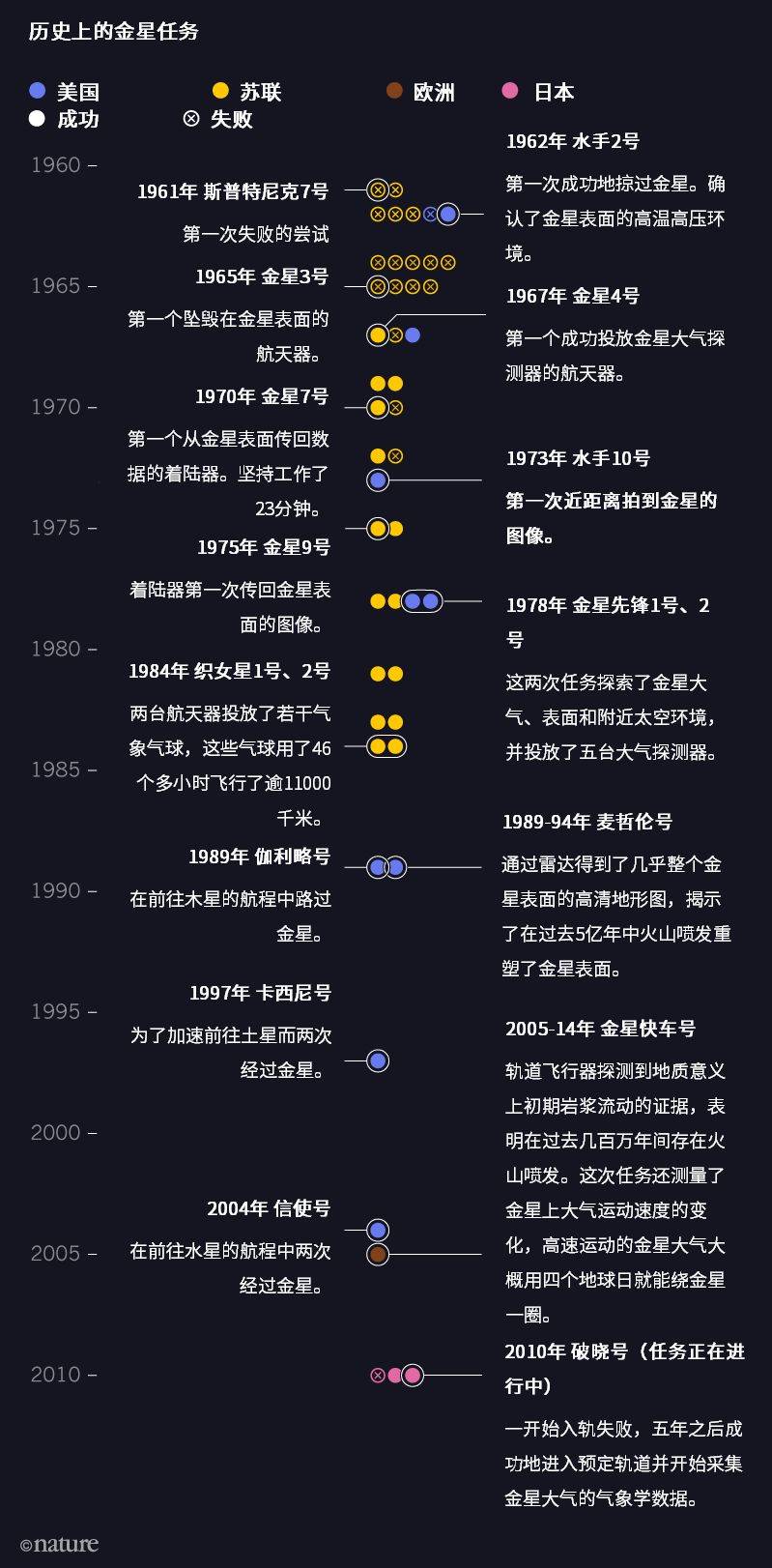 人类在最初走向太空时,就开始了对金星的探索。我们的邻居金星是第一次成功的行星际探测的目标(美国,1962年);也是探测器任务失败坠毁到的第一颗行星(前苏联,1965年);以及探测器成功着陆的第一个外星世界(前苏联,1970年)。正是在这场关于金星的太空竞赛中,科学家发现了一个炎热而剧毒的世界(参见“历史上的金星任务”)。这就解释了为什么人们探索金星的兴趣后来逐渐减退。