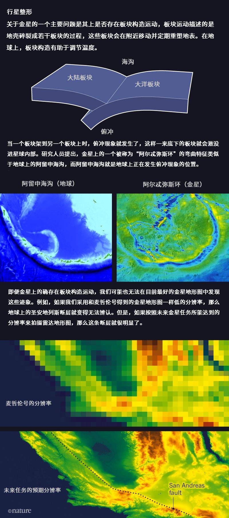 科学家们一致认为,俯冲现象是板块构造的第一步,然而在金星上还没有发现明显的大范围板块移动迹象——至少在几十年前麦哲伦号轨道飞行器绘制的地形图中没有找到。例如,地处太平洋板块和北美板块之间的圣安地列斯断层的宽度从几米到一公里不等,因为太窄所以无法在麦哲伦号的地形数据中辨认出来。