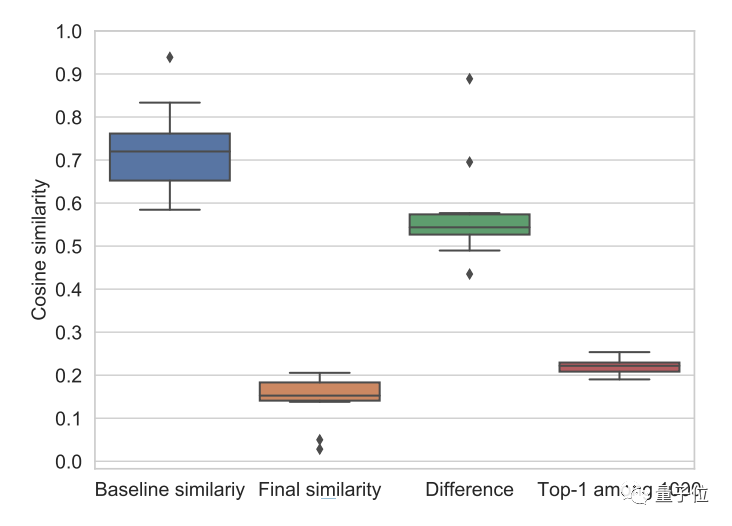 橙色,是一个人贴上对抗符前后,AI判断的类别相似度,降到了20%以下(判断类别不一致,人类不再是人类了)。