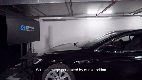 另外,腾讯团队也曾经用对抗图,骗过一辆特斯拉。