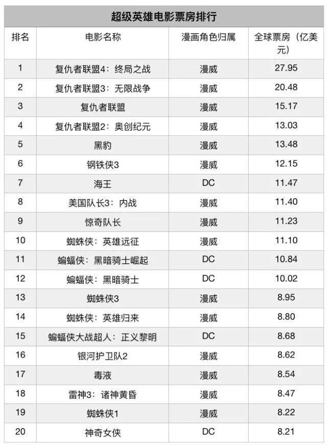 合流漫威的蜘蛛侠不仅为漫威带来新鲜血液,在票房上发力也甚为明显,在超级英雄前20票房中,仅蜘蛛侠一个IP就占据了4个席位,还不包括参演的漫威其他电影。