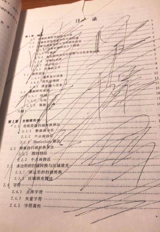 他买了一本《计算机图形学》,是清华大学计算机系的教材。我们当时买这本是二手书,翻开之后,发现目录页写满了前任读者疯狂的草书。