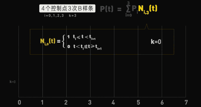 你仔细想想就会发现其实是这么个意思,挺有意思的。它的核心在于T的定义域以及它的控制点,它通过点来生成线。所以我们进一步来理解这个B样条的公式。
