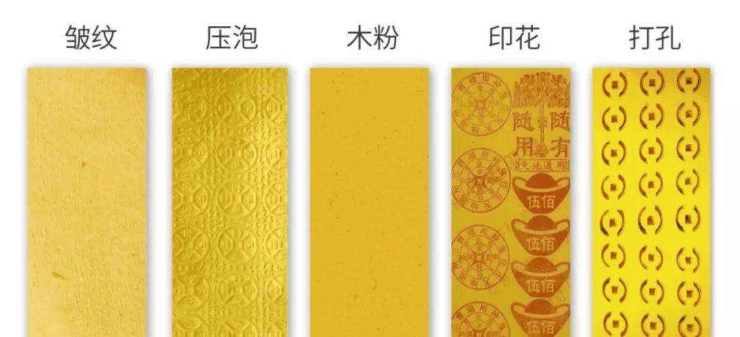 比如烧纸,我们可以看到烧纸有皱纹、压泡、木粉、印花、打孔,不同的工艺对应的是不同的制造逻辑。