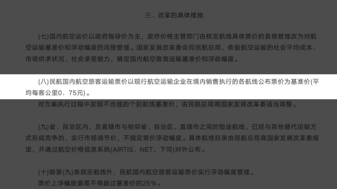 我们又找到了上一版中国机票定价公式,这是一个2004年的文件。很简单,航空里程乘0.75,也就是你飞一公里是0.75元,飞十公里就是7.5元,按这个方式给机票定价。
