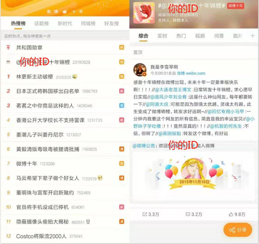 今天,微博为了庆祝十岁生日,还设置了开屏和热搜活动。热搜第一上方,会出现带有用户ID的假热搜,热度值为“20190828”。热搜内容随机生成,其中有个标题是#@xx(你的ID) 十年锦鲤。点开,会有一众大V转发祝贺你。