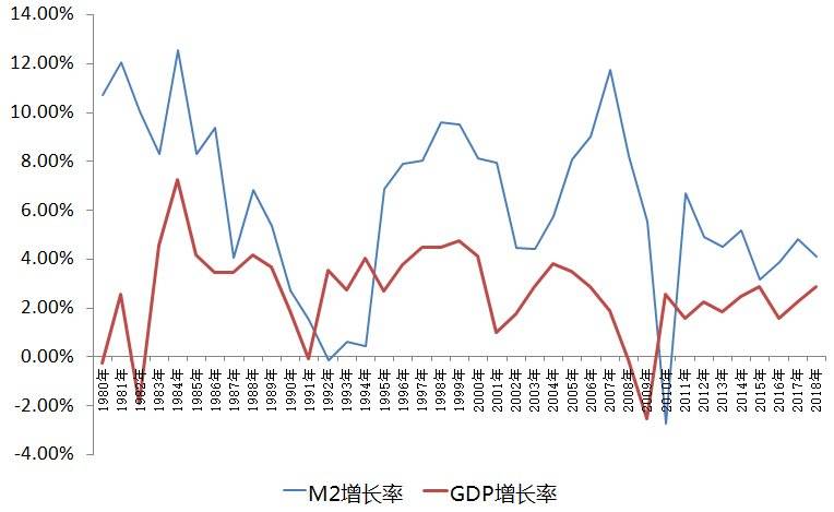 图:1980年~2018年美国GDP增长率及M2增长率,智本社