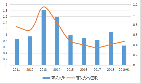 在因药品板块品牌单一而拖累业绩的情况下,云南白药并不试图改变这一现状,公司近些年可怜的研发投入反映了这一心态。数据显示,公司最近8年中仅有4年研发支出超过亿元,随着2014年后公司业绩增长压力不断加大,研发投入也从高点持续缩水,去年略反弹至1.10亿元,但占公司营收的比例依旧不足0.5%,今年上半年亦是如此,这在整体A股医药行业中处于倒数。