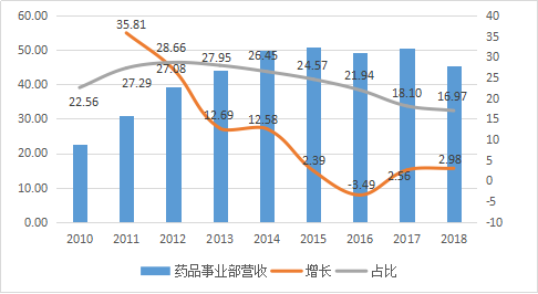 【药品事业部营收增长和占比情况(亿元、%)注:2018年为内部抵消后数据】