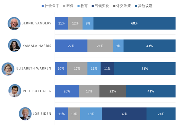 除了Pete Buttigieg,其他候选人的主要发声主要集中于美国本土议题,如社会公平、医保、教育、气候变化等。