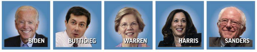 经过7月30日至31日的第二轮辩论,Real Clear Politics汇总出了民意支持率前五的候选人:Joe Biden、Pete Buttigieg、Elizabeth Warren、Kamala Harris、Bernie Sanders。