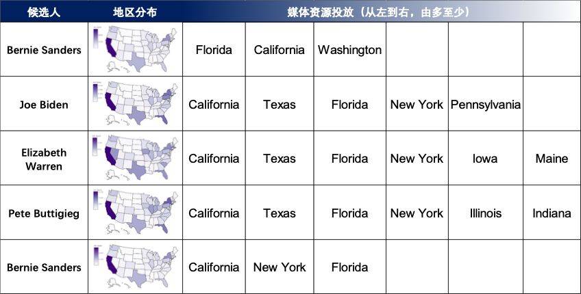 根据 2020 Campaign Tracker 的相关数据,民主党支持率前五的候选人广告投入除了传统的摇摆州,还集中于加州和“锈带地区”——这两处是传统意义上的民主党“票仓”,23位民主党候选人都希望在此争得一席之地。
