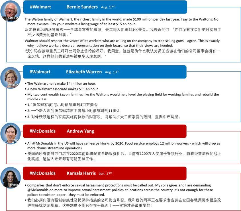 候选人关于麦当劳/沃尔玛的推特内容 资料来源:华盛顿邮报,推特,国泰君安证券研究