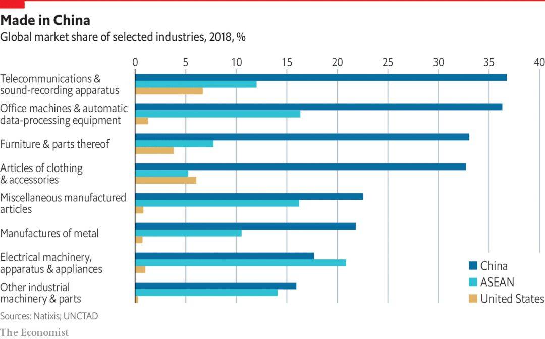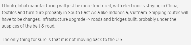 所以后面几年会有一个全新的全球制造格局开始形成。离开中国的生产业务会重新分散到了其他发展中国家,只有一小部分生产在自动化技术的帮助下转移到了美国。这一重新布局可能会让中国在整个供应链中的所占份额有所减少,但总体而言,中国依然占据了相当大的份额。
