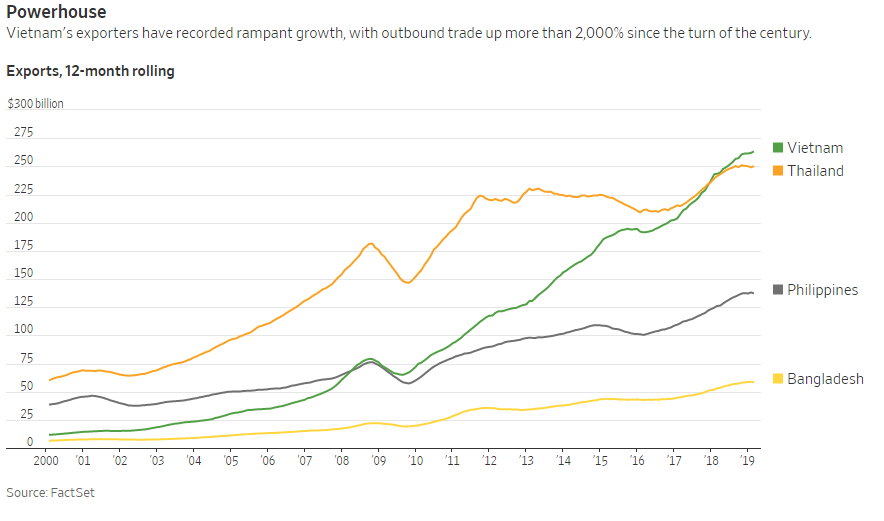 这些国家中只有越南几乎是中国的翻版,一切以经济建设为中心。越南在过去的20年中,出口额从不到100亿美元增长到今天的近2750亿美元。今天的越南已经超过了菲律宾、泰国,其GDP增长已经接近6%。