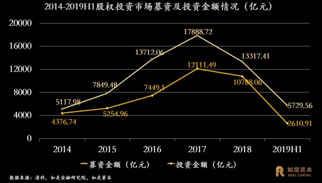 但进入2018年,随着《资管新规》、A股IPO审核趋严、上市公司暴雷、海外上市破发等政策及市场环境的变化,过去三年股权市场由狂热瞬间降到了冰点,募资端开始了大幅的下滑。转眼,2019年已过大半,股权市场彻底进入了冰河期时代,2019年上半年股权市场投资总额仅实现2611亿人民币,同比大幅下滑59%,回到了2015年的水平。但与2015年不同的是募资端还在持续下滑,2019年上半年募资额同比下降了19.4%。