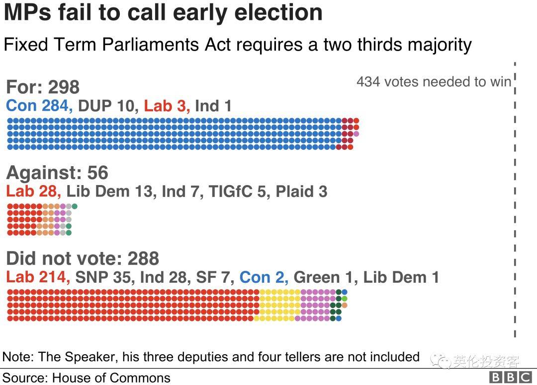 根据固定任期议会法案,鲍里斯需要需要三分之二的议员投赞成票,即434票支持才能发起提前大选,然而他最终只得到298票支持和56票反对——比他所需的数字少了136票。
