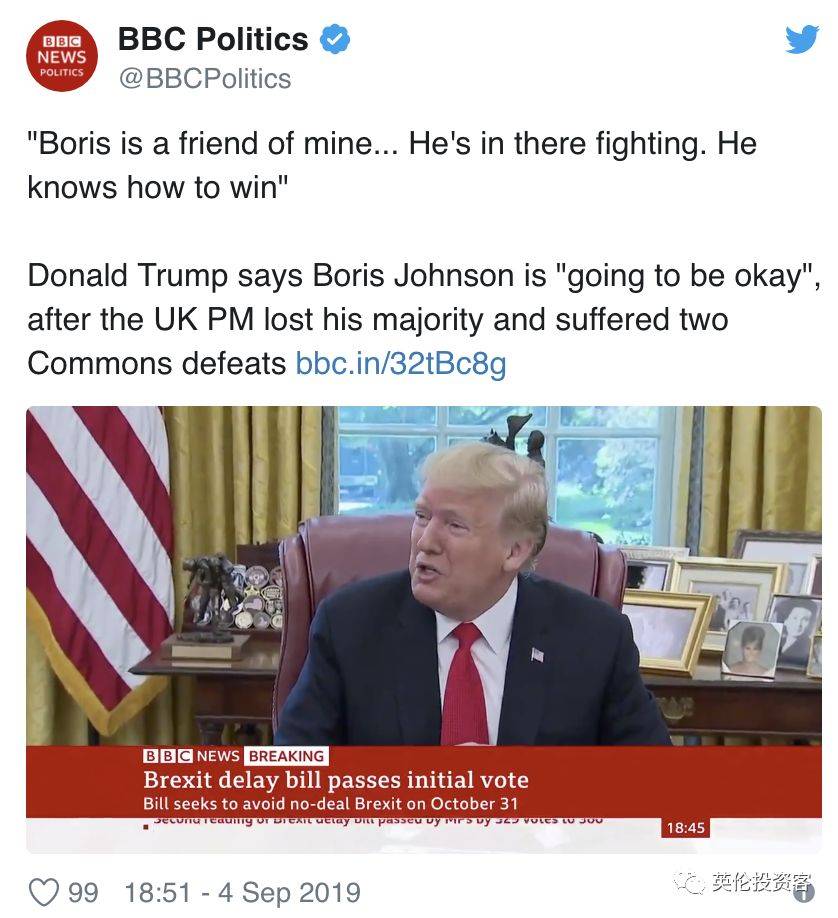 有意思的是,鲍里斯惨败的消息一出,马上也传到了远在大西洋对岸的美国总统特朗普耳中。