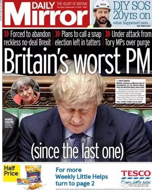 《每日镜报》今日头版刊出讽刺性标题:英国最糟糕的首相(上一任之后)…