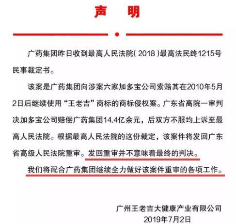 鸿道集团则坚称在与广药集团的合作协议中,已经成功将王老吉商标租赁延期至2020年,双方各执一词对簿公堂,2012年5月的中国国际经济贸易仲裁委员会裁定书中裁定鸿道集团停止使用王老吉商标。