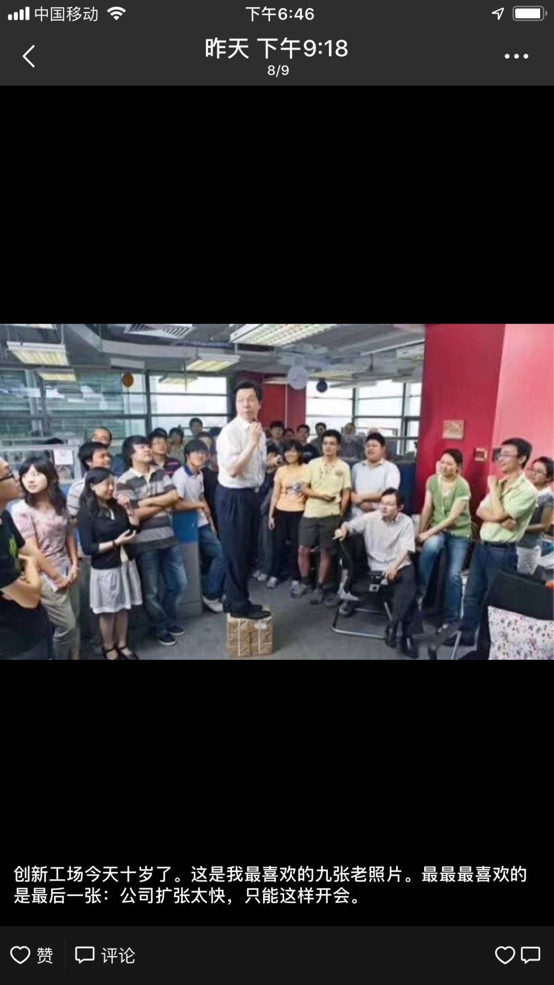 “十年前的今天,创新工场成立……一直没有忘记初心:真心帮助年轻创业者、坚持做技术型投资人,让中国创新得到世界尊重。”