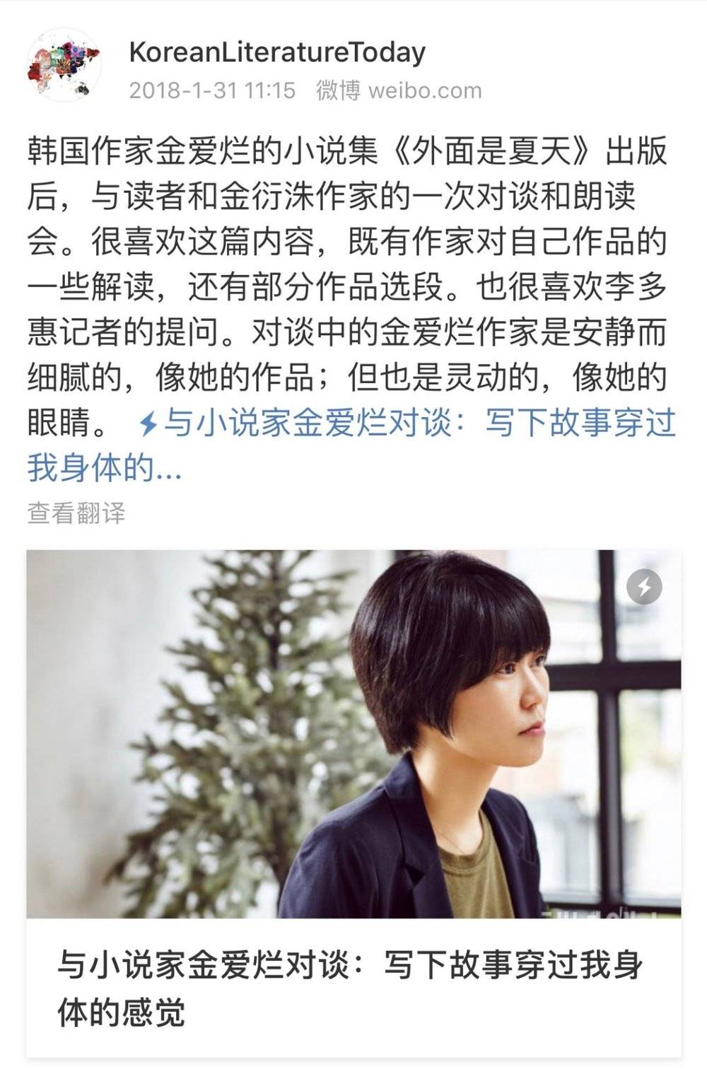 2017 年 7 月,Channel Yes 在金爱烂作家的短篇小说集《外面是夏天》出版时,曾与读者和金衍洙作家一起进行的访谈和作品朗读会。“对谈中的金爱烂作家是安静而细腻的,像她的作品;但也是灵动的,像她的眼睛。”(《写下故事穿过我身体的感觉》@KoreanLiteratureToday 译)两年过去了,金爱烂作家仍是一如既往。