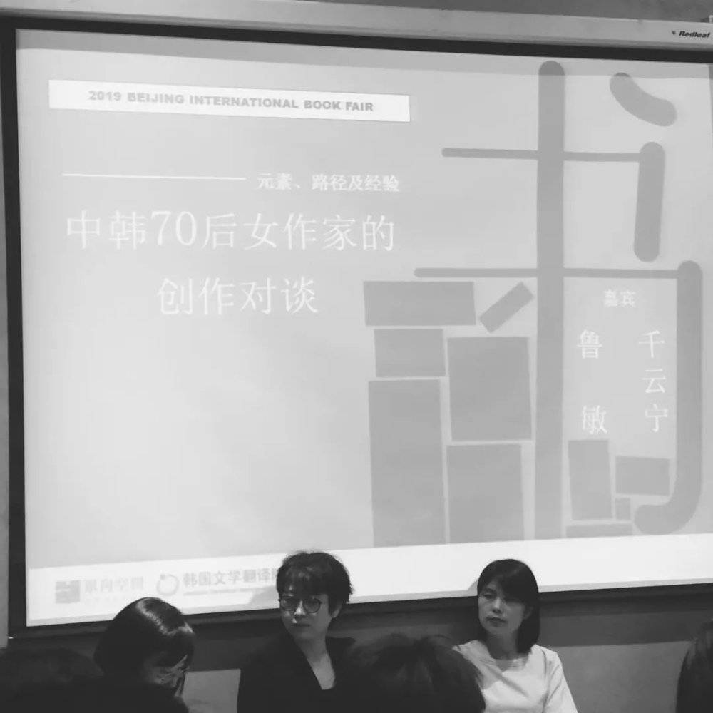 那天是北京国际图书博览会文学沙龙关于韩国文学的最后一场,翻译薛舟、徐丽红老师双双出席,早一日结束行程的韩国作家千云宁也到场旁听。读者们都很激动,几度鼓掌致谢,有人递过新鲜的杯装水果茶,金爱烂作家接了,顺势放到桌上,手里只握着笔,目光很温柔地落在等待签书的读者队列上。