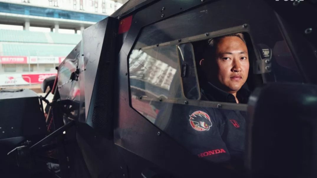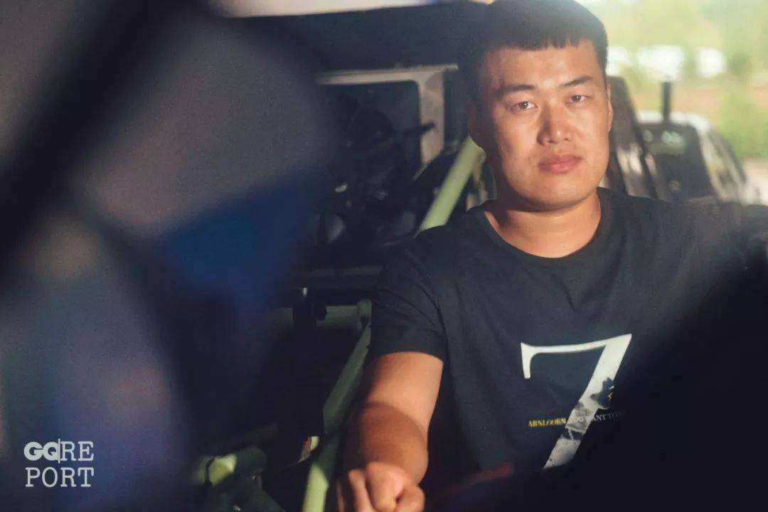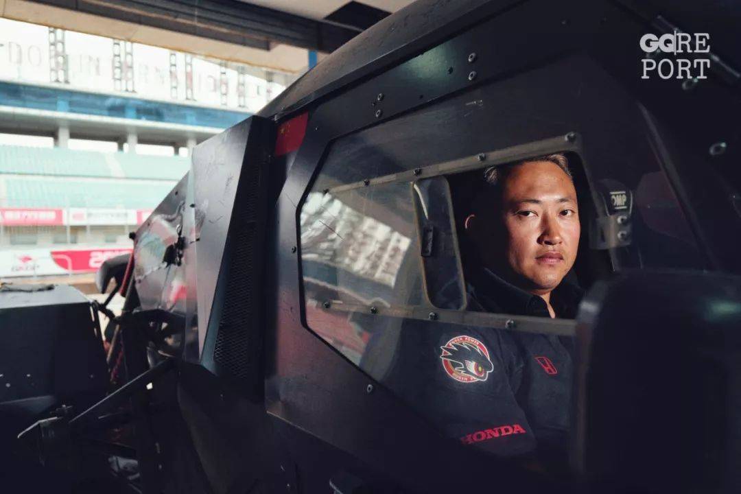 他身高175,体重160斤,穿上紧身的赛车服,肚子往前突了出来。跨过驾驶室下面的防滚架,他低头躲开上方的防滚架,把自己塞进座位、戴上头盔。