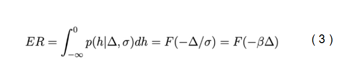 如果把决策界面(decision boundary)设置为 0,当 h > 0 时模型选择选项 A,当 h < 0 时选择 B, h = 0 时随机选择。那么由带噪声表示的决策变量导致的错误概率分布为: