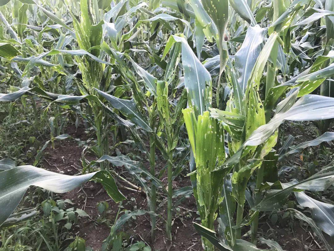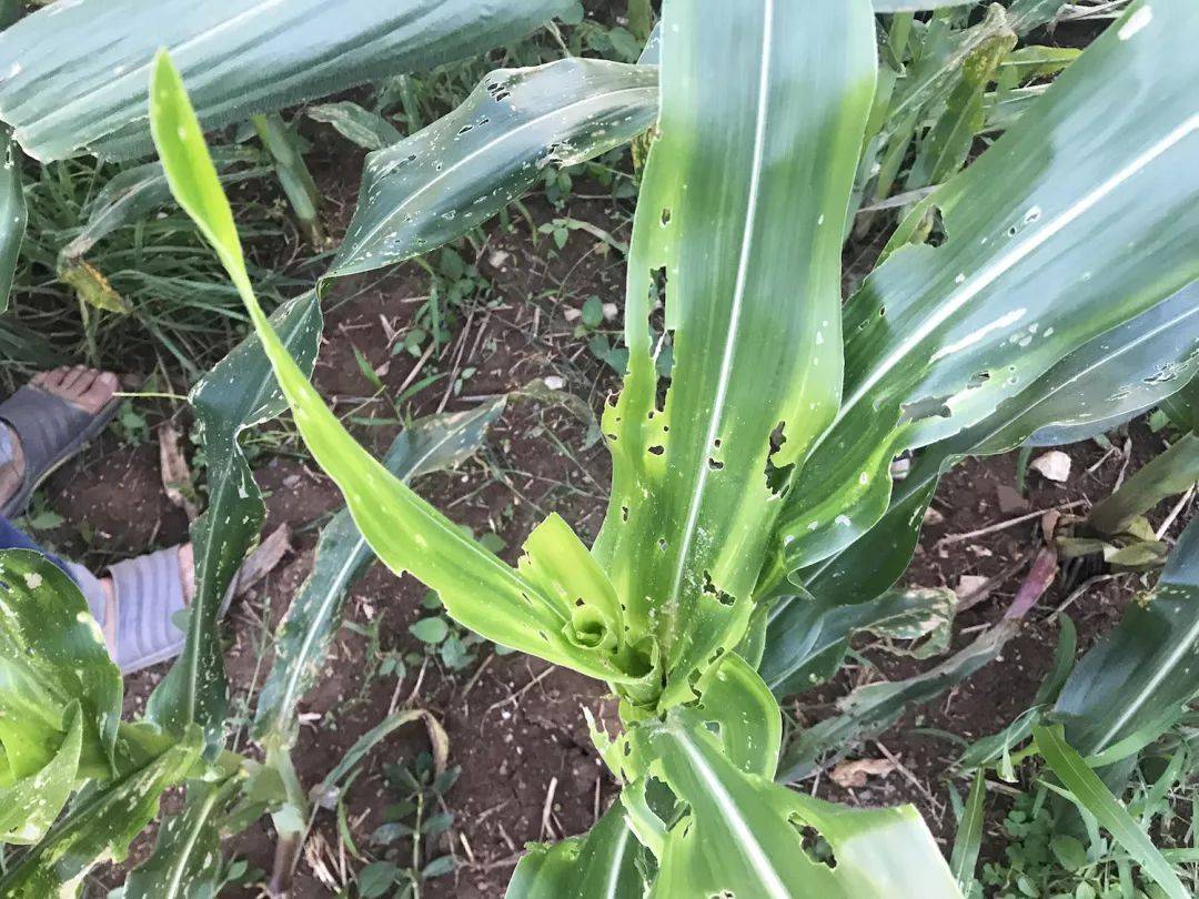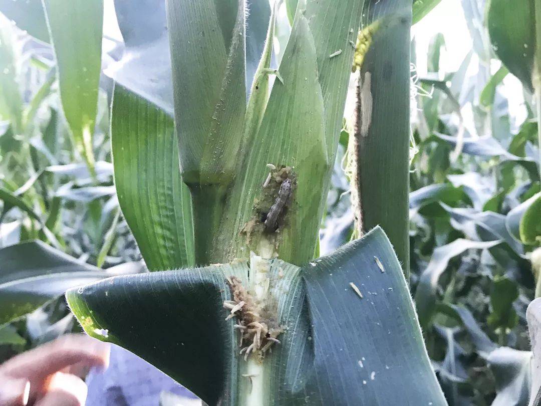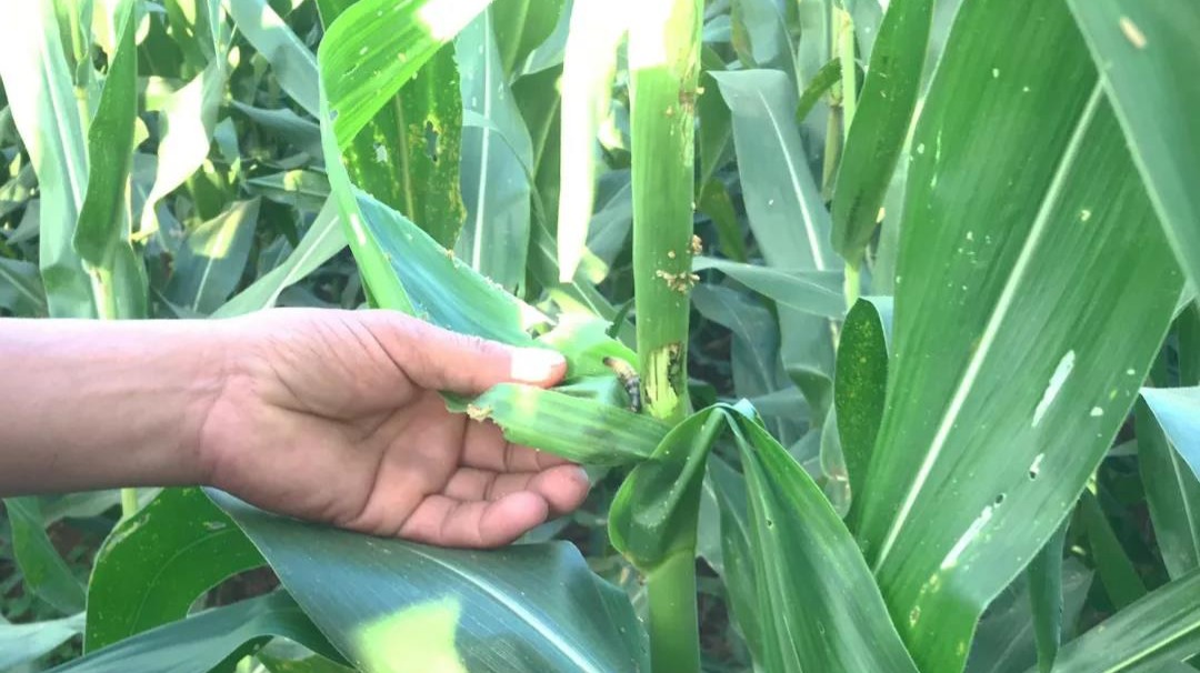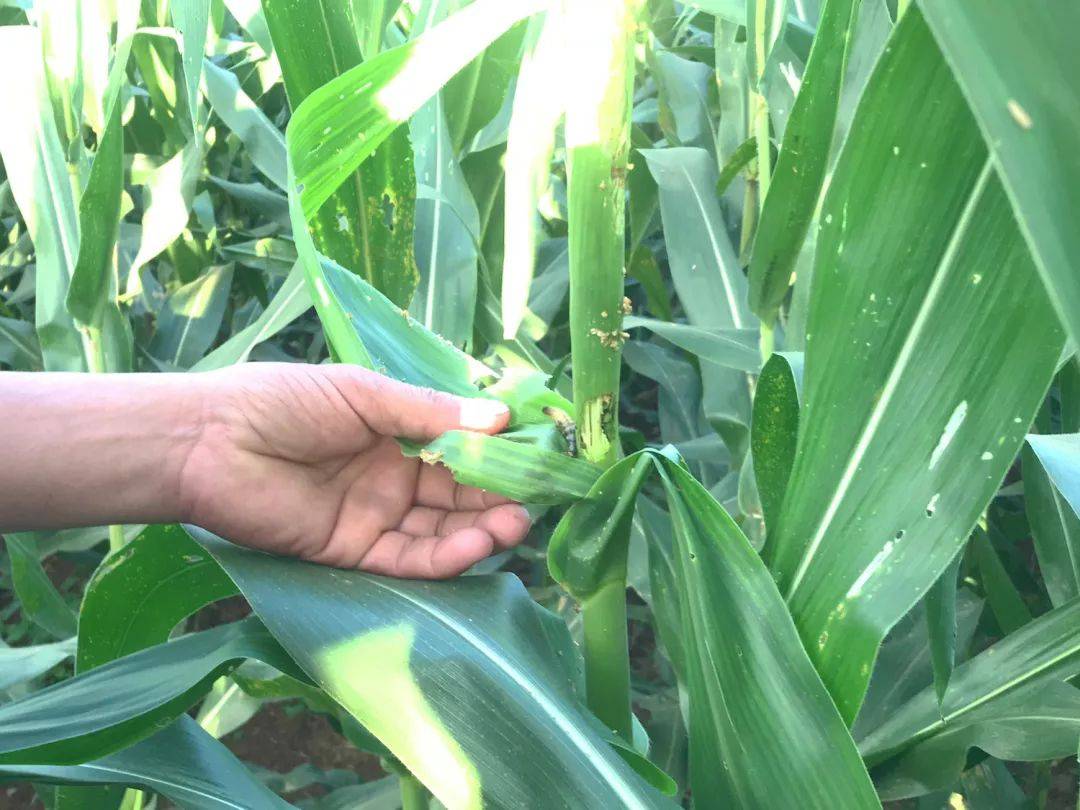 在一米高的玉米植株上,虫子钻进喇叭口里,留下黄棕色的粪便;或是把叶子咬得千疮百孔,甚至直接咬断,破坏叶片的光合作用,影响植株生长。而像王叔家的玉米,已经长到一人多高、再过一个月就能收成了,幼嫩的玉米棒子上却遍布虫咬的洞口——这样下去,今年的收成令人担忧。