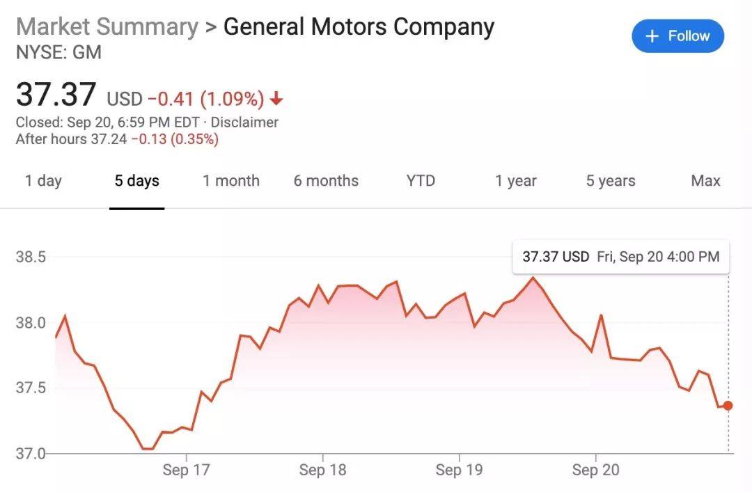 近5万名美国工人不以为意。9月15日那天的最后一分钟,他们开启了美国12年来规模最大的全国性罢工,导致9个州的33个工厂和22个零件配送仓库关闭,预计通用每天的营收损失达1亿美元(一说每天4亿,总之数额巨大)。而资本市场给出了实时的伤害评估: